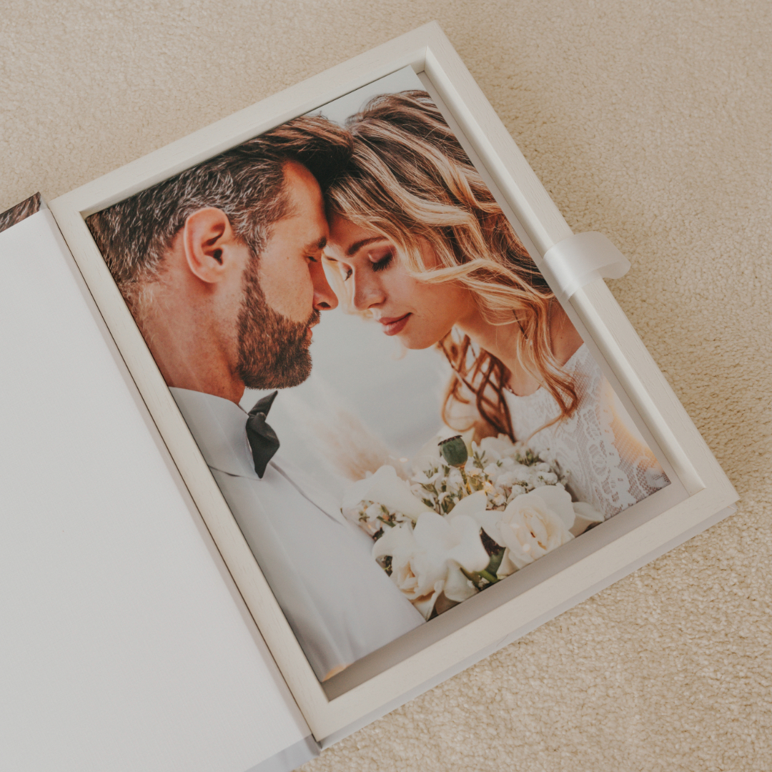 Uma box para guardar o álbum de casamento não só irá proteger o teu álbum de danos como também irá adicionar um toque especial na apresentação. Adiciona à box os vossos nomes, data do casamento ou até mesmo uma frase especial, tornando a tua box única e significativa.